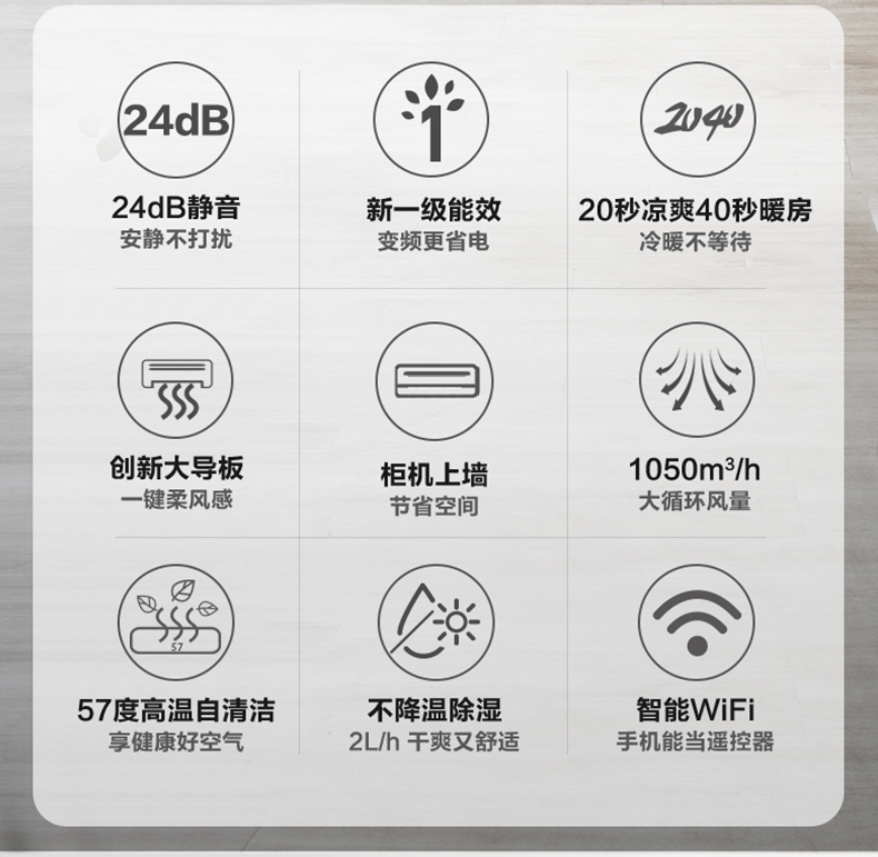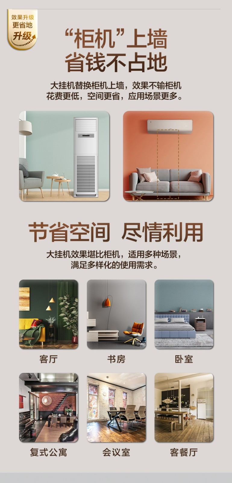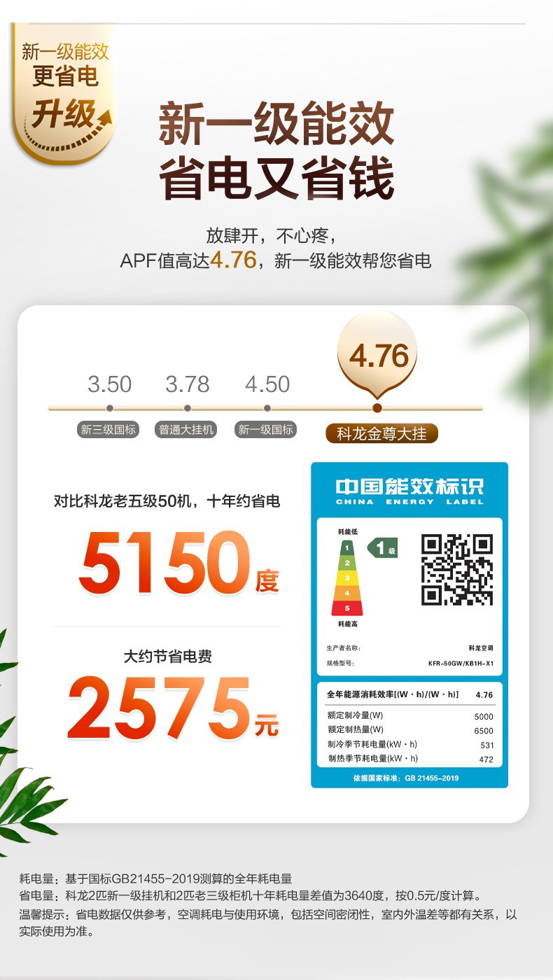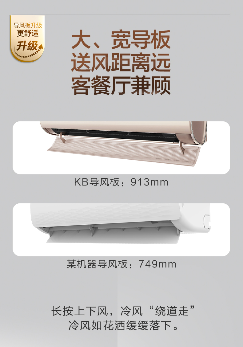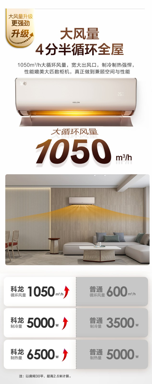 1050m³/h澎湃风量,带动全屋舒适温度,923mm大导板设计,上下左右精准导风,仿高尔夫球面设计,柔化出风效果不直吹,APF4.76新一级能效 一年多省515度电