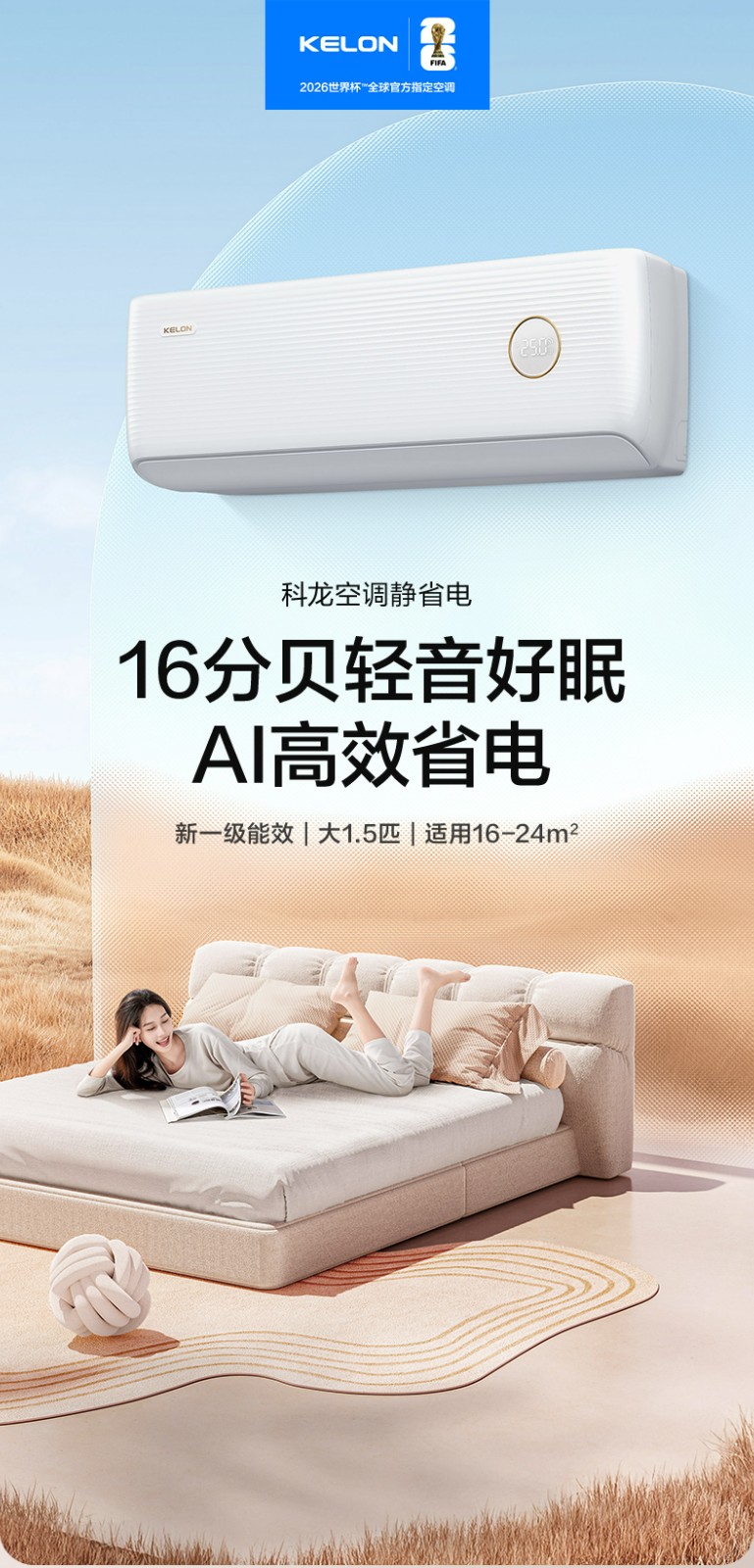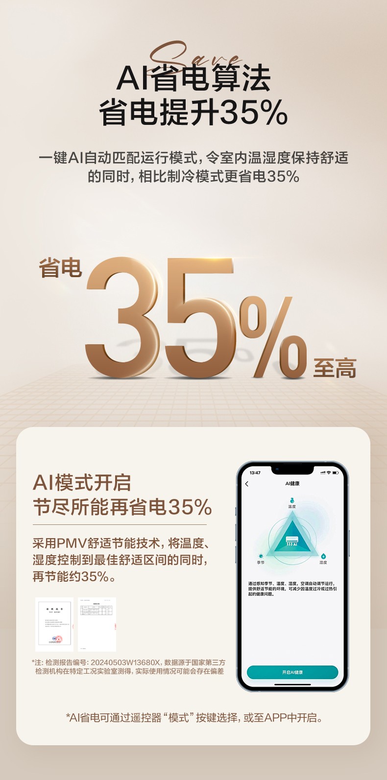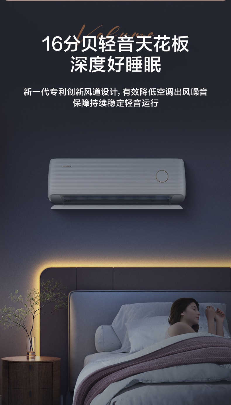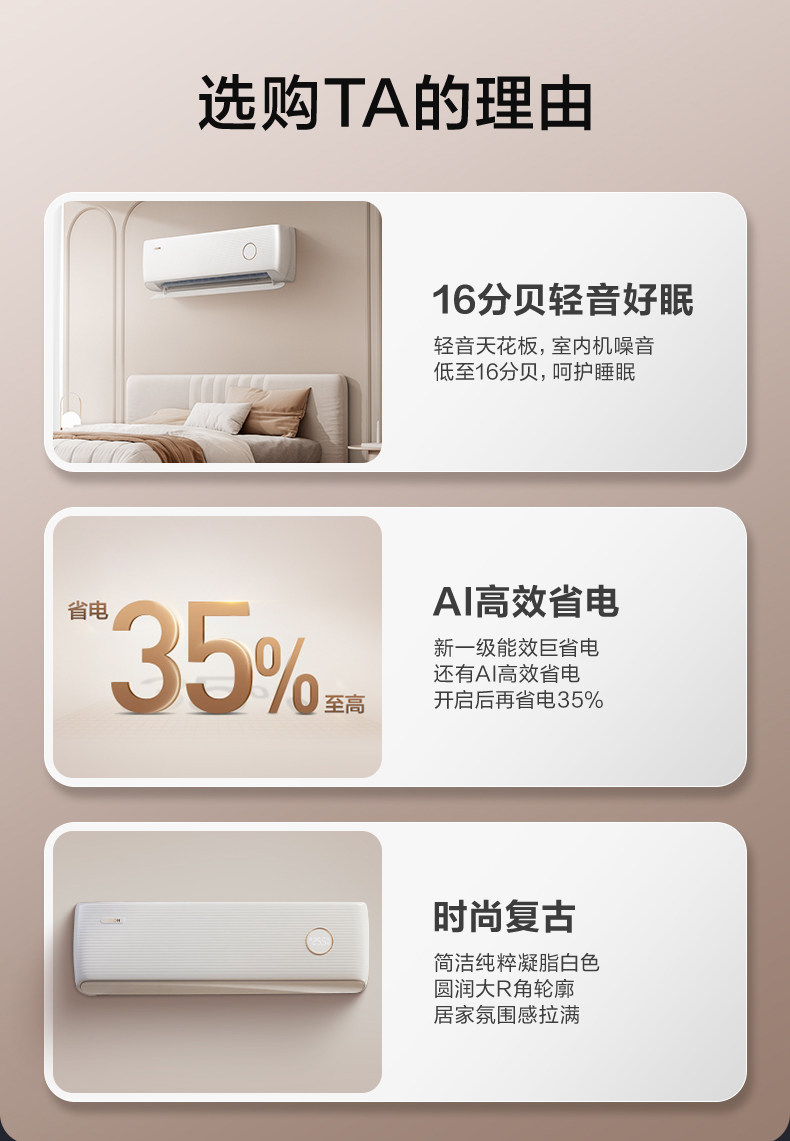 16分贝轻音好眠,从温度,声音,光线等,全方位呵护顾客的睡眠 拥有AI省电模式,对比制冷模式最高可再省电35%