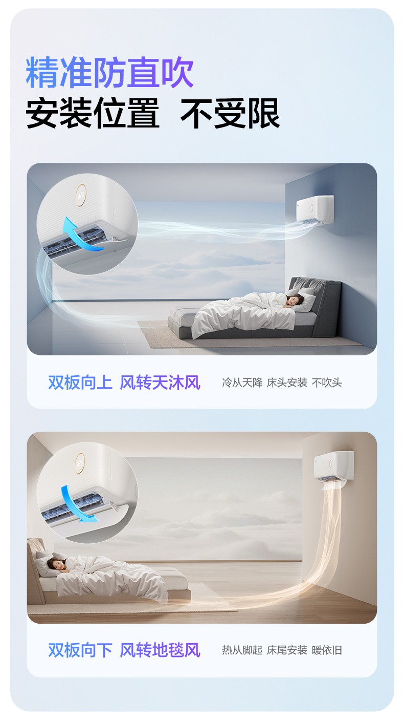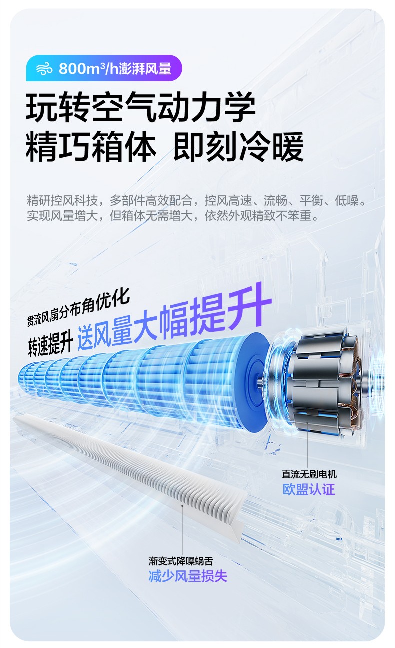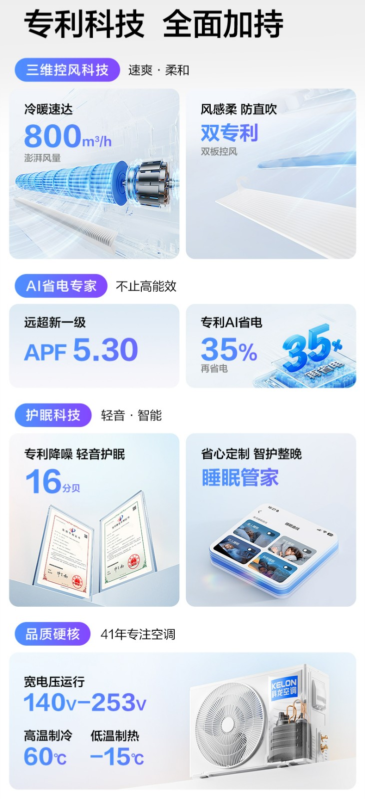 配置高,搭载双排冷凝器、双排蒸发器、500级铜线电子膨胀阀、行业TOP3品牌压缩机等,APF值高达5.3,远超国家一级能效标准。16分贝轻音好眠,行业中噪声至低的空调。800m³/h的巨大风量,实现20S凉爽 40S暖房的快速冷热效果。