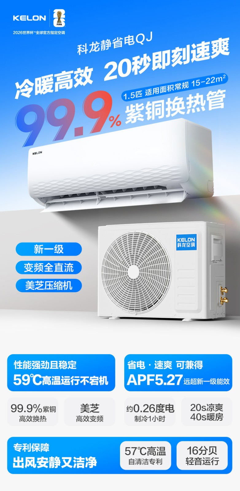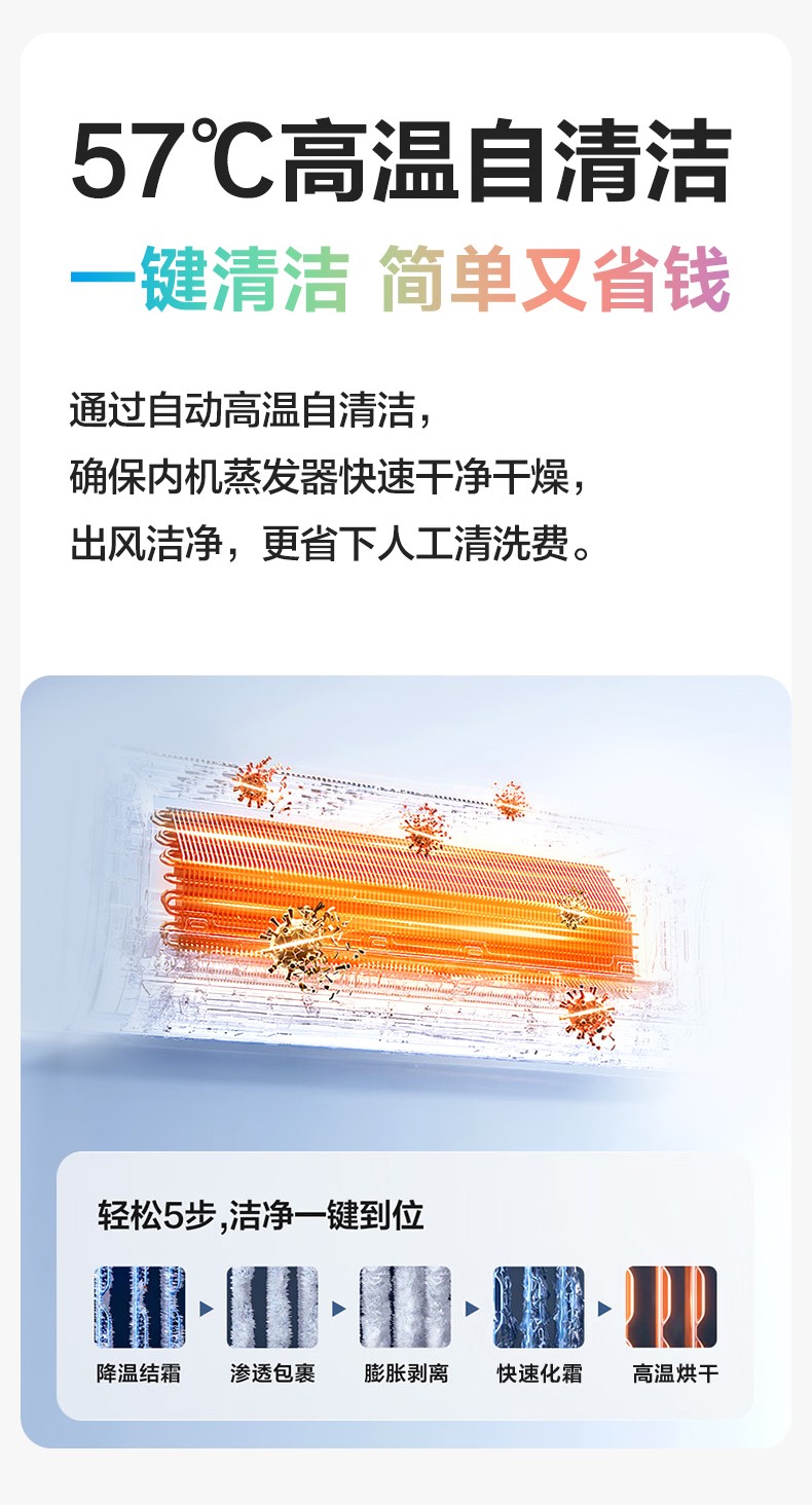 冷暖高效,20秒即刻速爽。性能强劲且稳定,省电·速爽可兼得。16分贝轻音运行,57°℃高温自清洁专利,出风安静又洁净。