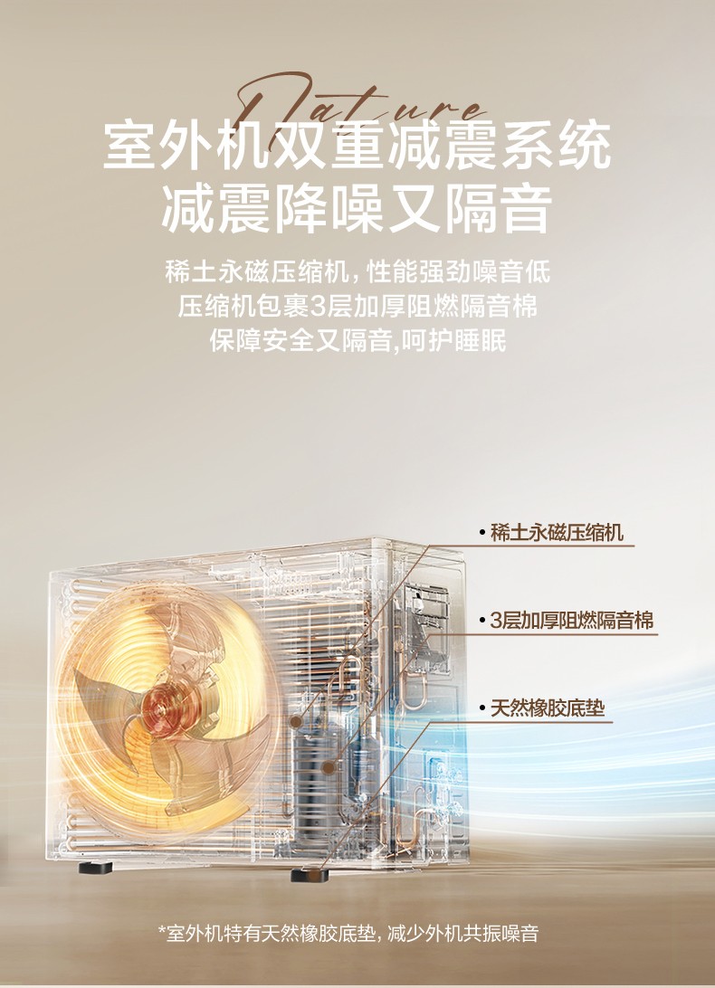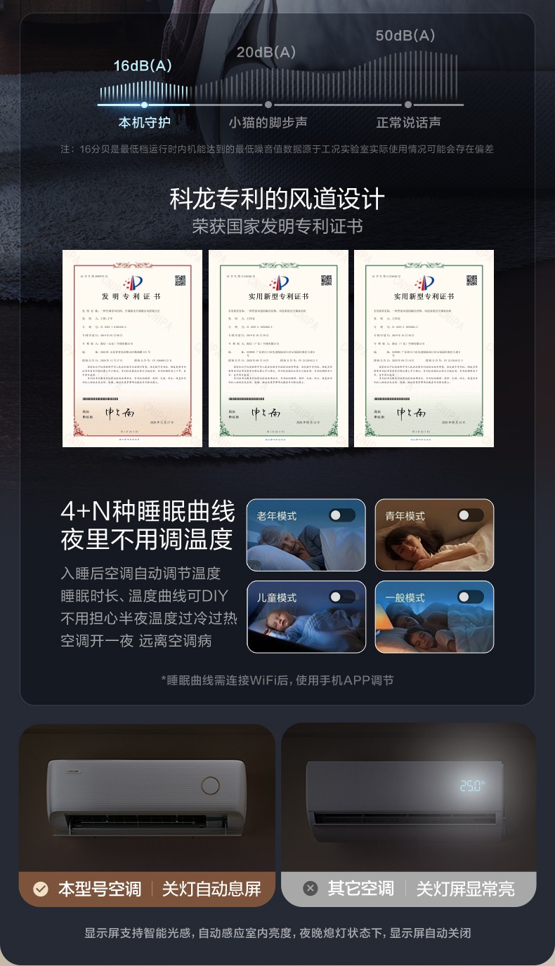 16分贝轻音好眠,从温度,声音,光线等,全方位呵护顾客的睡眠 拥有AI省电模式,对比制冷模式最高可再省电35%